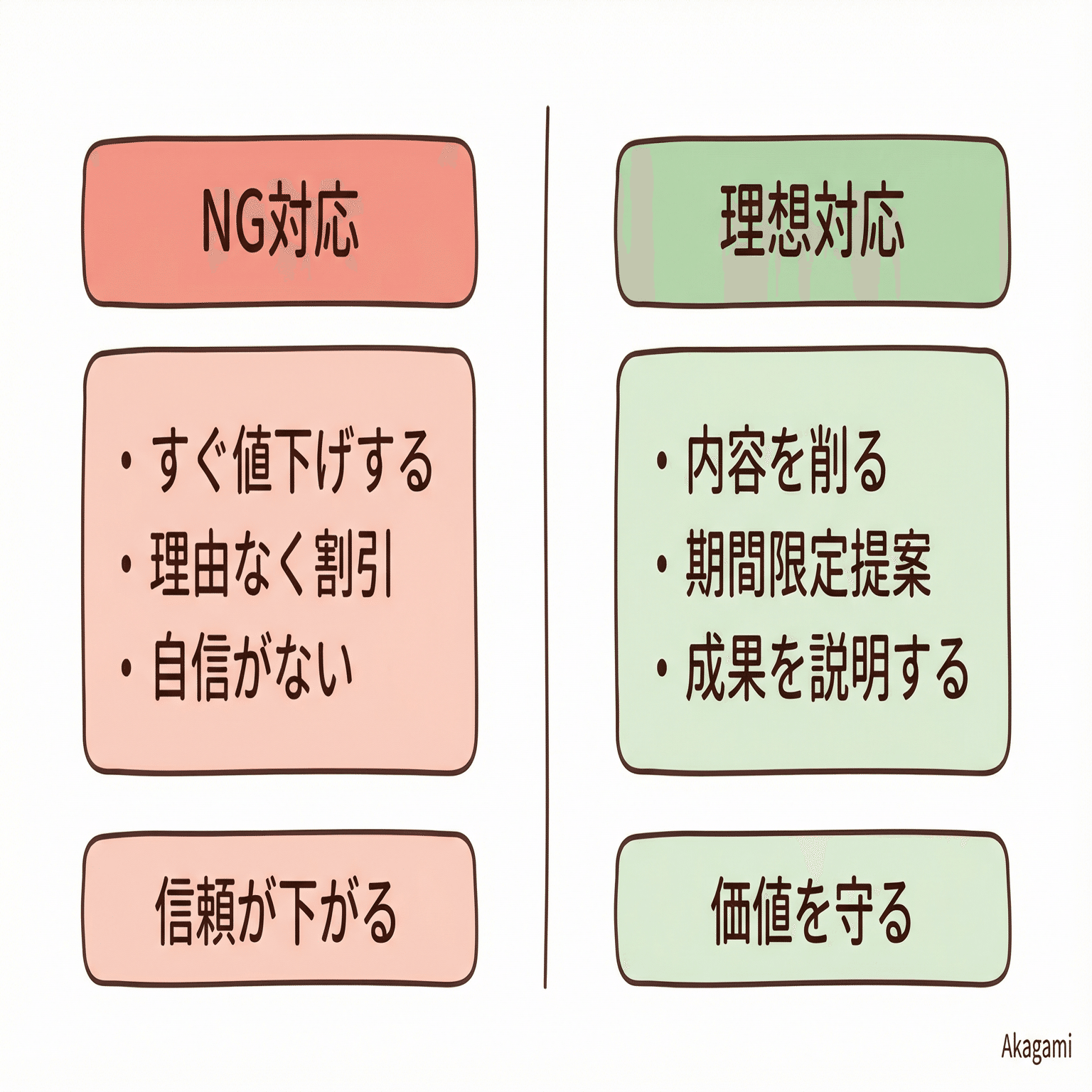 例えば、「分析レポートをなくす代わりに、こちらの価格でいかがでしょうか?」といった形で、価値を維持しながら代替案を提示します。自分の価値を守ることが、長期的な収入を守ることにつながります。