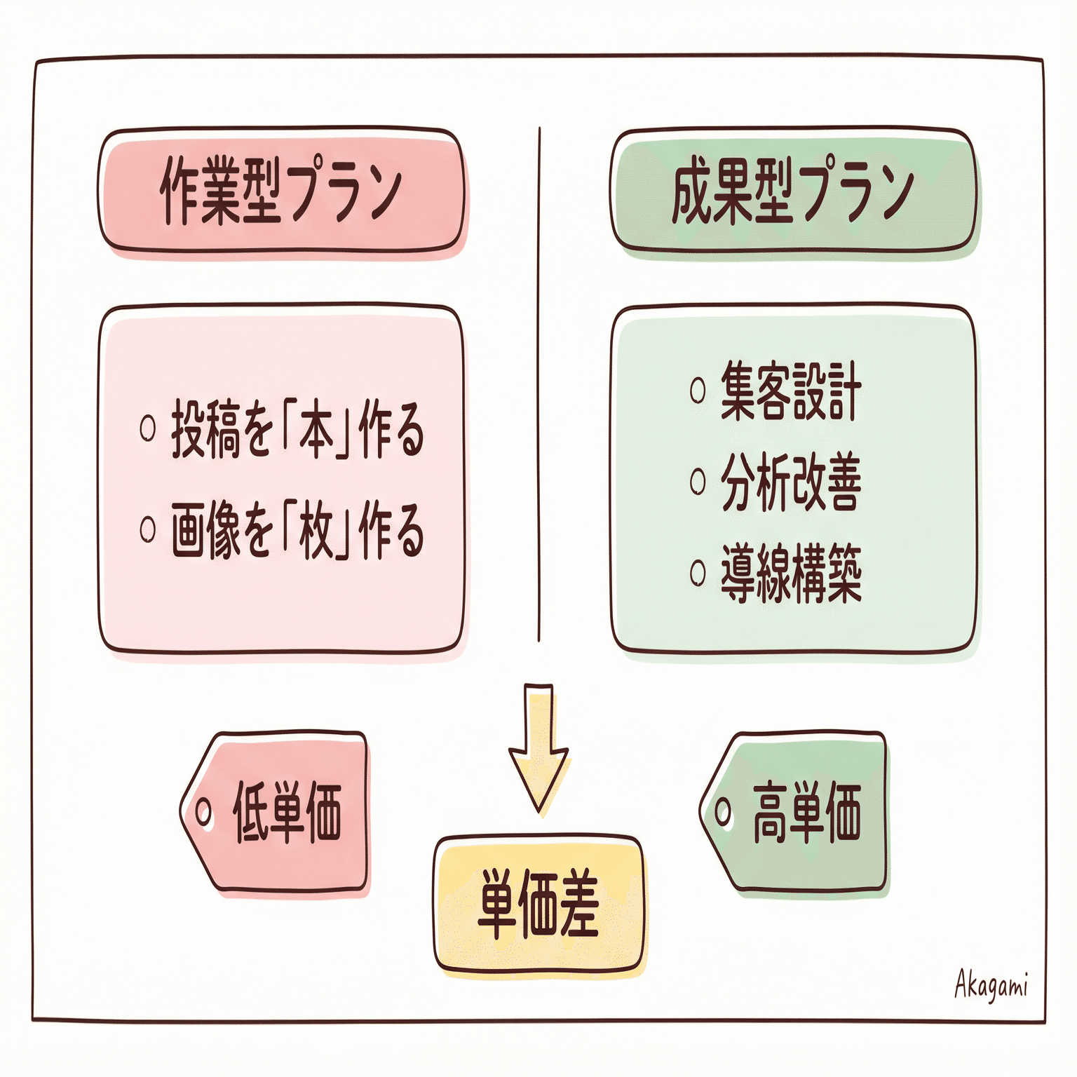例えば、「投稿作成のみ」であれば3〜5万円が相場かもしれませんが、「分析+改善提案」まで含めると8〜15万円、あるいはそれ以上を目指せます。成果に近づくほど、提供価値は高まり、価格も上げられるのです。