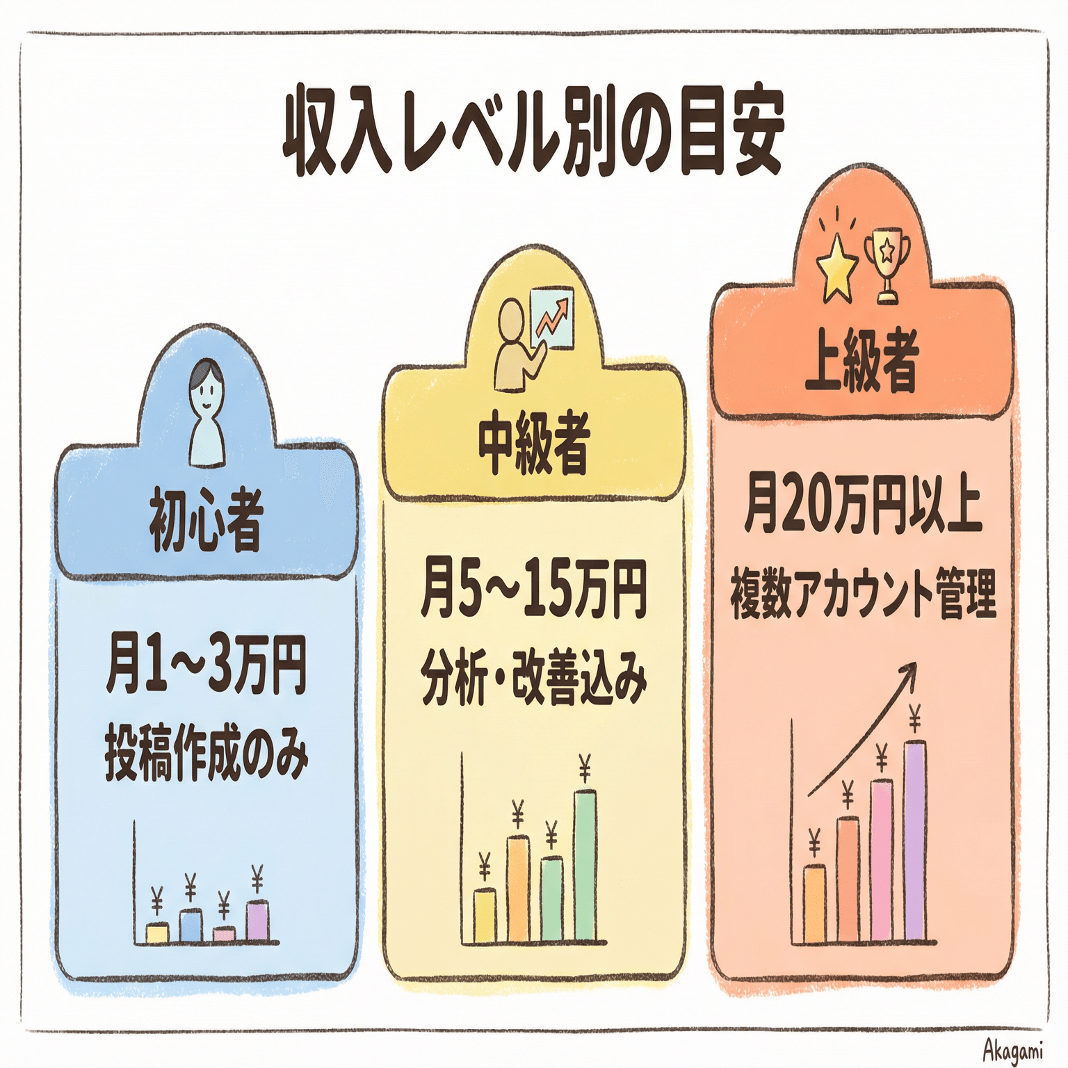 初心者のうちは月1万円から3万円で投稿作成のみといった簡単な業務からスタートすることが多いでしょう。分析や改善提案まで含めると月5万円から15万円、複数のアカウントを管理し、戦略立案から関わる上級者になれば月20万円以上を目指すことも可能です。