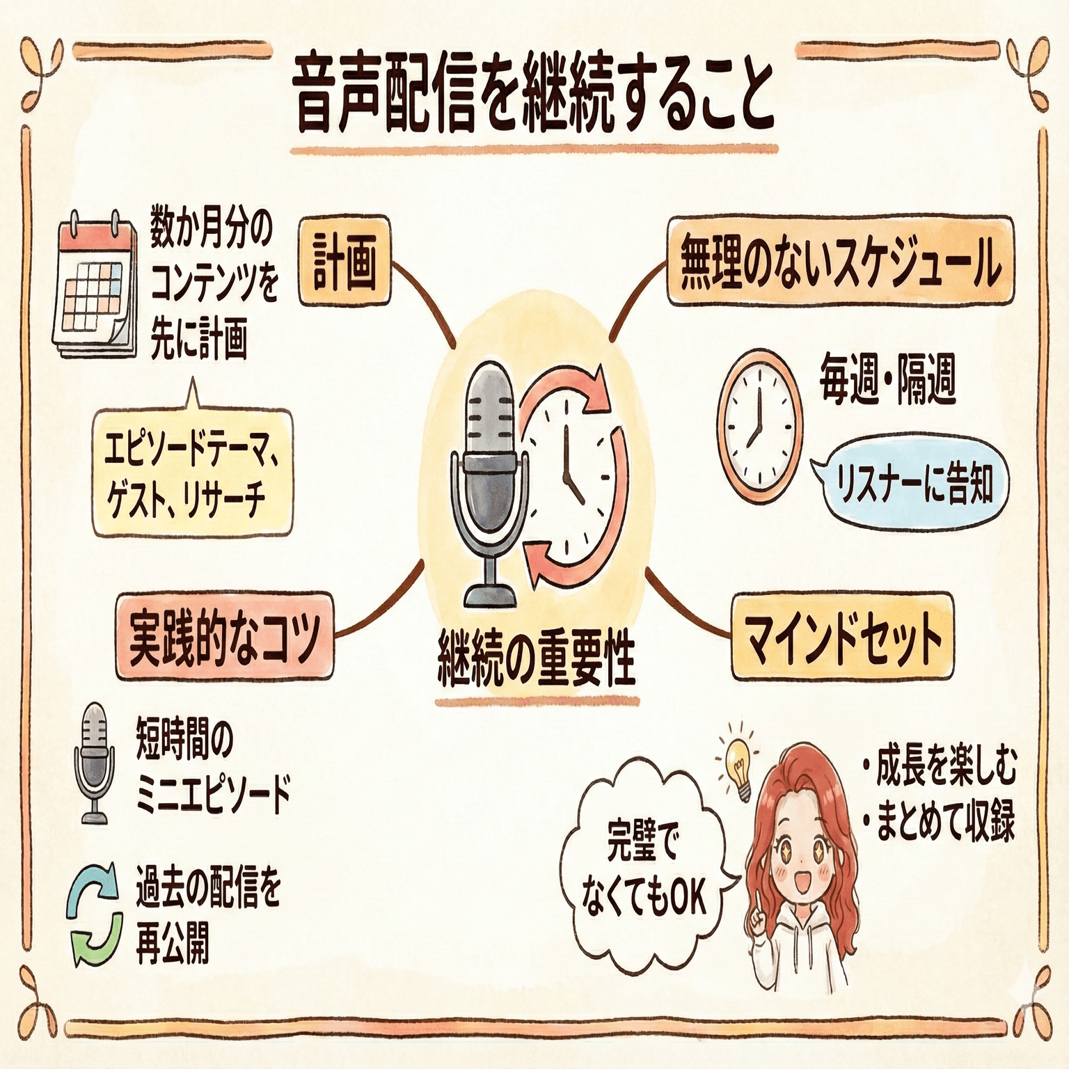 継続のための実践的なコツもあります。長めのエピソードだけでなく、短時間のミニエピソードを挟むこと。あるいは、過去の配信を再公開して時間的な余裕を確保するのもおすすめです。