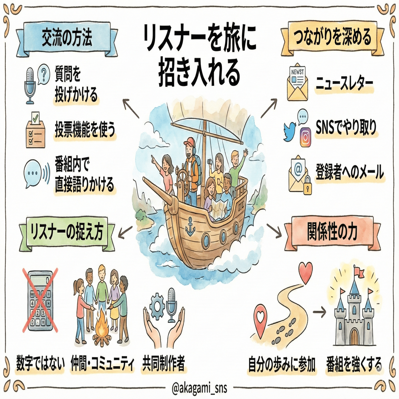 リスナーを数字ではなく、仲間でありコミュニティであり、時には共同制作者として考えてみてください。自分の歩みに参加していると感じてもらえる関係性が、番組を強くします。