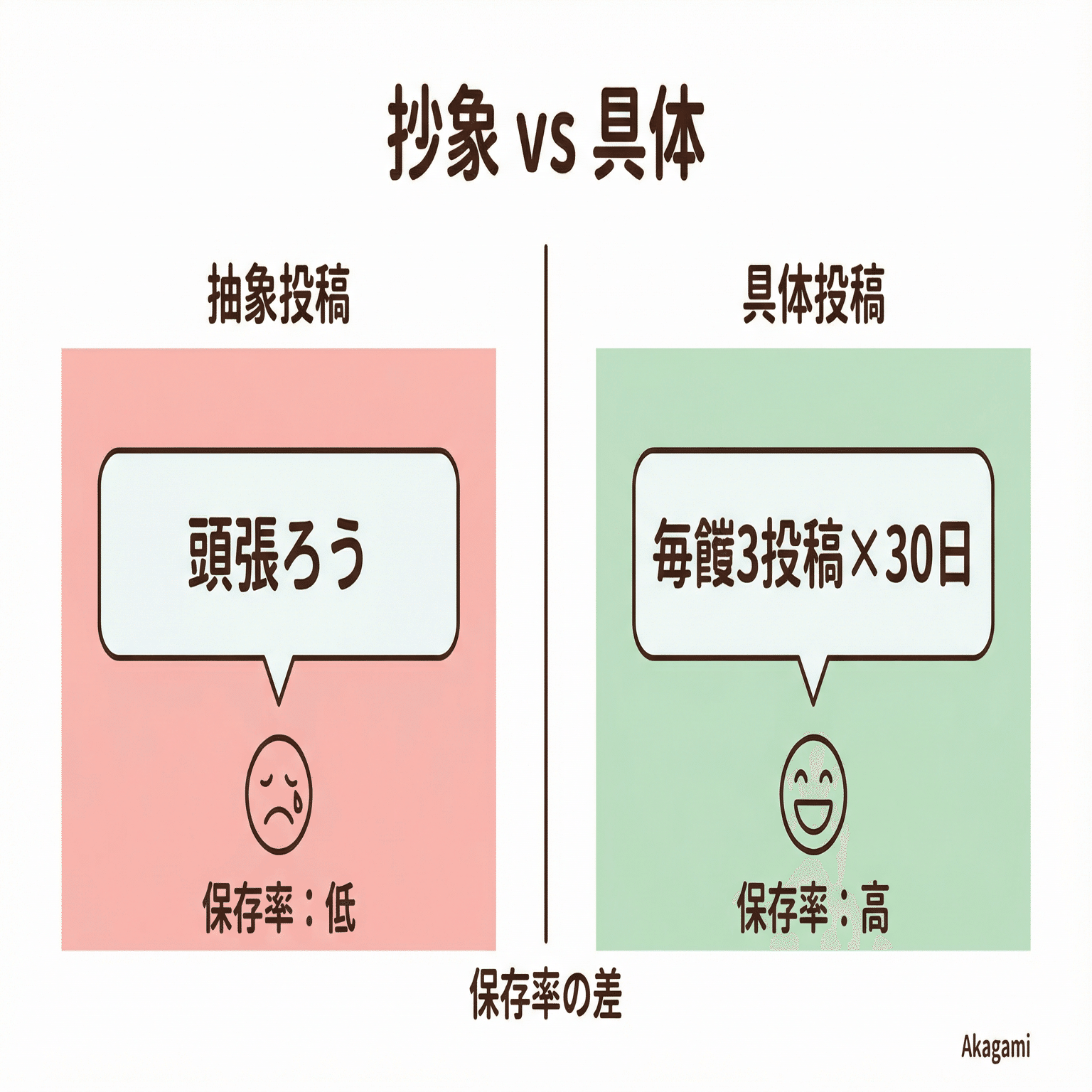 「頑張ろう」という精神論だけでは、読者の心には響きません。「毎日3投稿を30日間続けてみよう」と具体的な数字で示すことで、読者は行動のイメージが湧き、投稿を「後で見返したい価値ある情報」として保存してくれるのです。