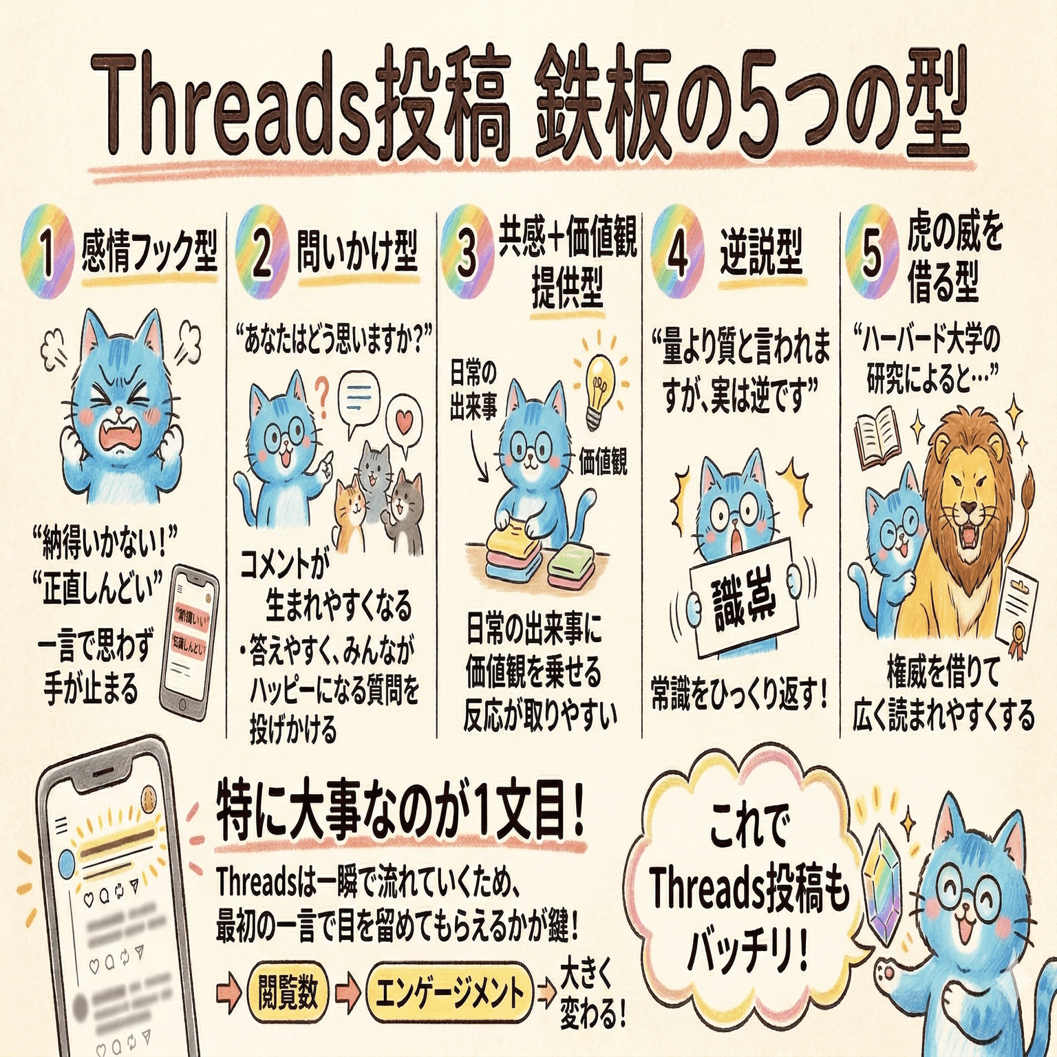 この5つは鉄板の型です。特に大事なのが1文目です。Threadsは一瞬で流れていくため、最初の一言で目を留めてもらえるかが、閲覧数やエンゲージメントを大きく左右します。